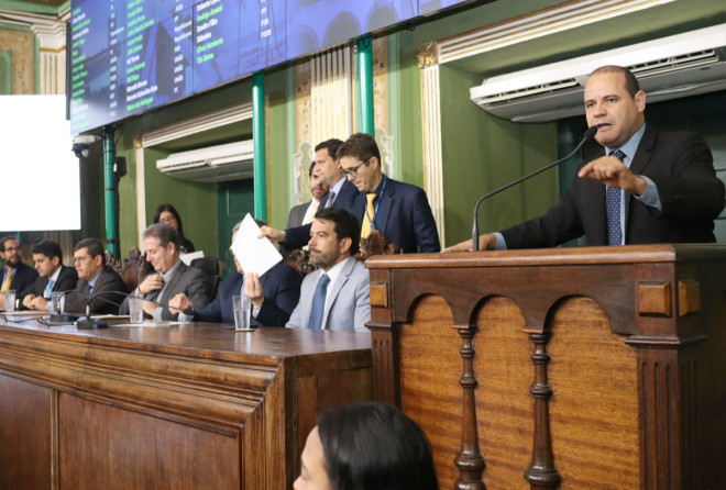 Brito, no Plenário Cosme de Farias. Do outro, a vereadora Marta Rodrigues