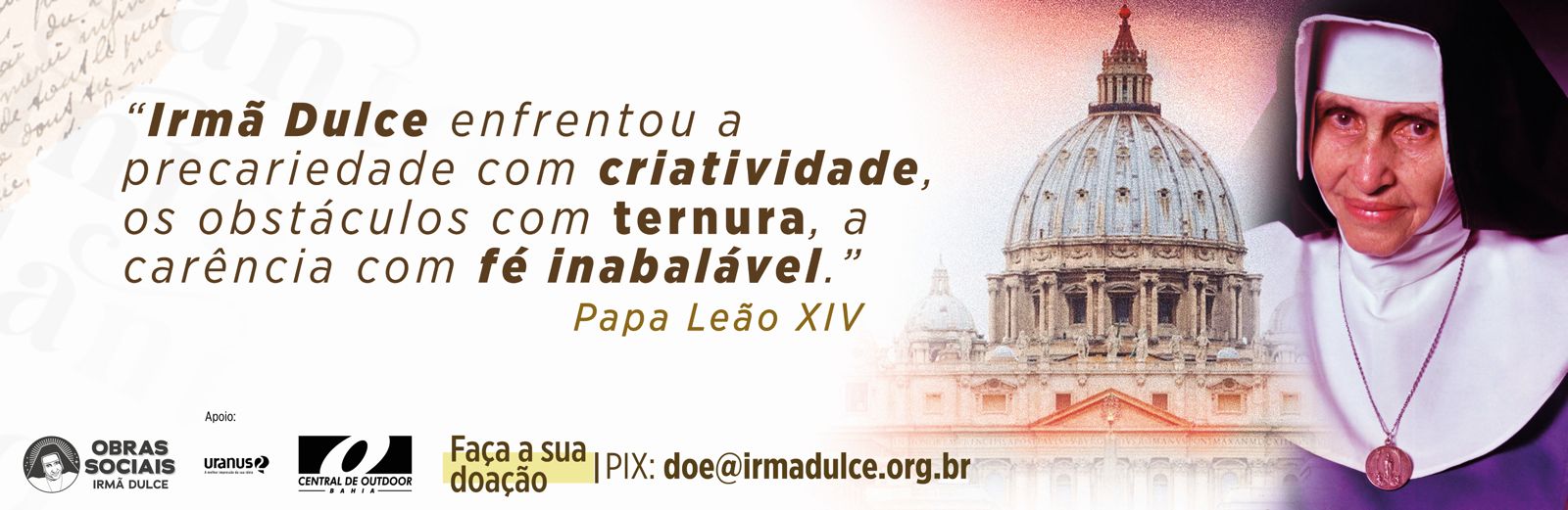 Além da idealização dessa campanha, a Central de Outdoor Seccional da Bahia também apoia diretamente a divulgação das ações das Obras Sociais Irmã Dulce com o lançamento de outra campanha que já está também nas ruas. A peça convida a sociedade a fazer parte dessa corrente do bem, por meio de doações que ajudam a manter milhares de atendimentos gratuitos realizados diariamente, e a também fazer doações por meio do pix doe@irmadulce.org.br.
