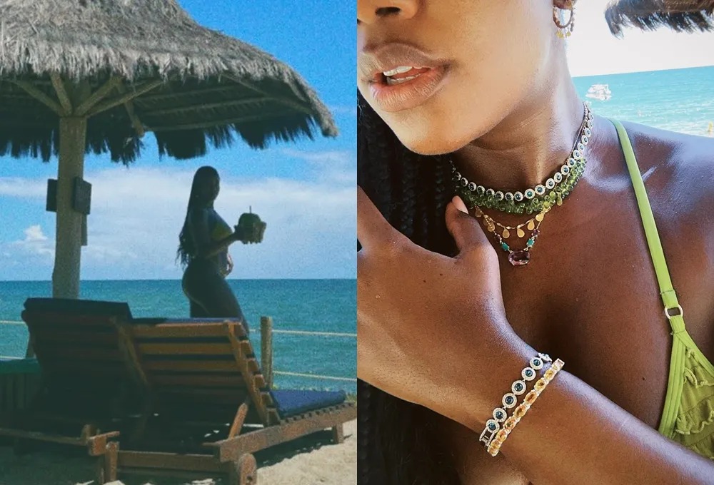 Na postagem, a cantora aparece em um conjuntinho de biquíni verde em meio ao visual paradisíaco. Em um dos cliques, a carioca ainda mostrou o bronzeado e alguns colares.