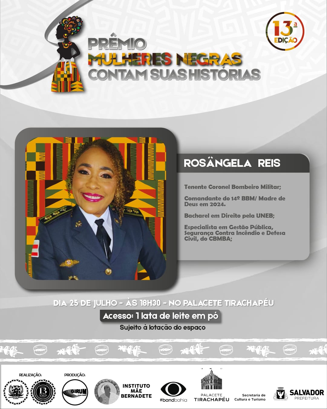A tenente-coronel Rosângela Pereira Reis do Nascimento foi uma das mulheres homenageadas na 13ª edição do Prêmio Mulheres Negras Contam Suas Histórias. Natural de Salvador, Rosângela construiu uma carreira sólida no Corpo de Bombeiros da Bahia, com passagens por diversas funções estratégicas. Ingressou na corporação em 1995 e, ao longo dos anos, desempenhou funções como Coordenadora de Finanças, Subcomandante do 3º BBM, Coordenadora de Comunicação Social e, em 2024, assumiu o comando do 14º BBM em Madre de Deus. Além da atuação militar, possui formação em Direito pela UNEB e especialização em Gestão Pública, Segurança Contra Incêndio e Defesa Civil.