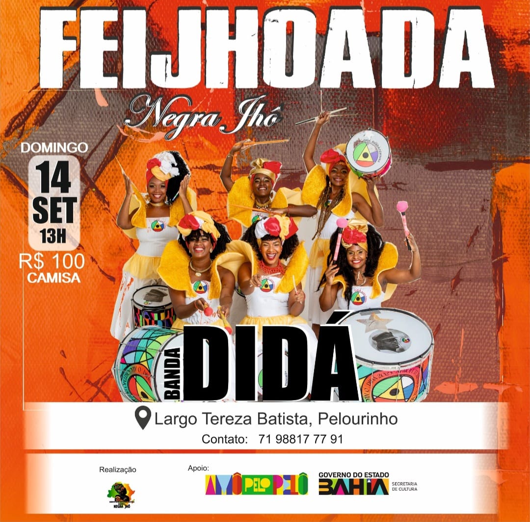 A tradicional Feijhoada da Negra Jhô acontece no dia 14 de setembro (domingo), a partir das 13h, no Largo Tereza Batista, no Pelourinho, em Salvador, reunindo cultura, música e gastronomia. O evento, organizado pela renomada cabeleireira e produtora cultural Negra Jhô, contará com a presença da Banda Didá, responsável por animar o público com suas batidas marcantes.