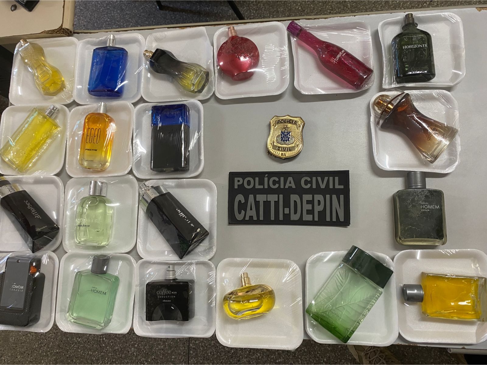 perfumes falsificados, os quais serão submetidos à perícia. Todo o material