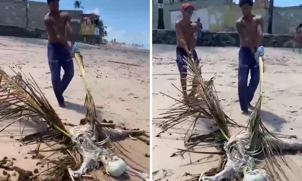 redes sociais mostram o momento em que pessoas retiram o corpo do mar, já em