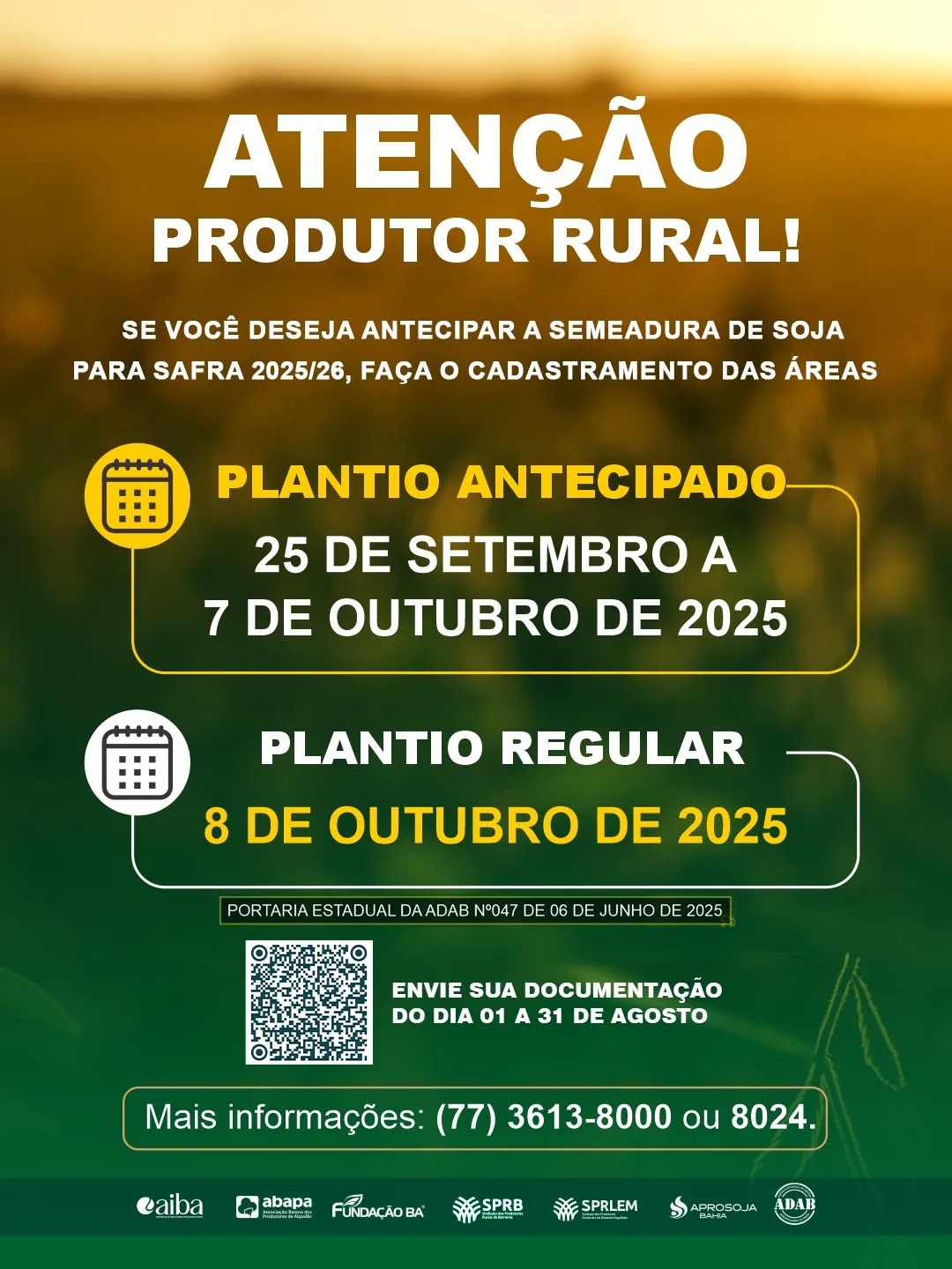 cadastramento em tempo hábil, e se atentarem às datas do calendário do plantio