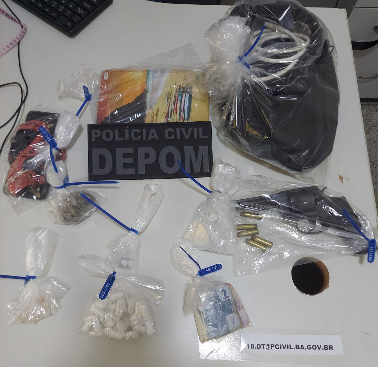 Na busca pessoal, os policiais encontraram, dentro da bolsa do suspeito, um revólver calibre .38 com numeração suprimida, cinco munições intactas, porções de cocaína, crack e maconha embaladas em eppendorfs, além de uma pedra de crack, comprimidos de Nobésio, dinheiro em espécie, um caderno com anotações ligadas ao tráfico e um saco com embalagens plásticas utilizadas para acondicionamento de entorpecentes.