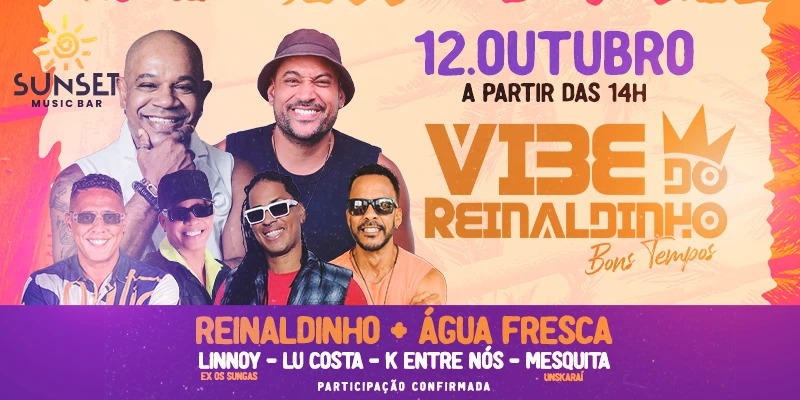 O cantor Reinaldinho, ex-integrante do Terra Samba, apresenta no dia 12 de outubro, a partir das 14h, no Sunset Music, em Pituaçu, Salvador, o projeto “Vibe do Reinaldinho – Bons Tempos”. A estreia contará com os shows da banda Água Fresca e dos artistas Linnoy (ex-Os Sungas), Lu Costa, K Entre Nós e Mesquita (Unskarai), que dividem o palco com Reinaldinho em uma celebração dos clássicos do pagode baiano.
