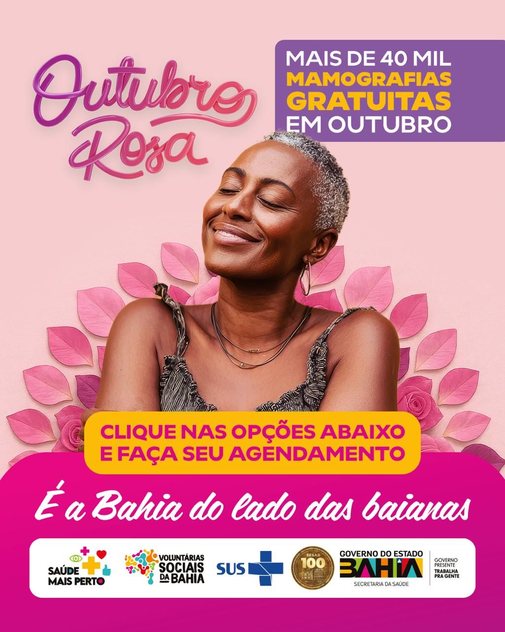 Está aberto o agendamento das mamografias de rastreio do câncer de mama da campanha Outubro Rosa. Serão ofertadas 40 mil mamografias para mulheres entre 40 e 69 anos. Compartilhe com todas as mulheres que você ama.
